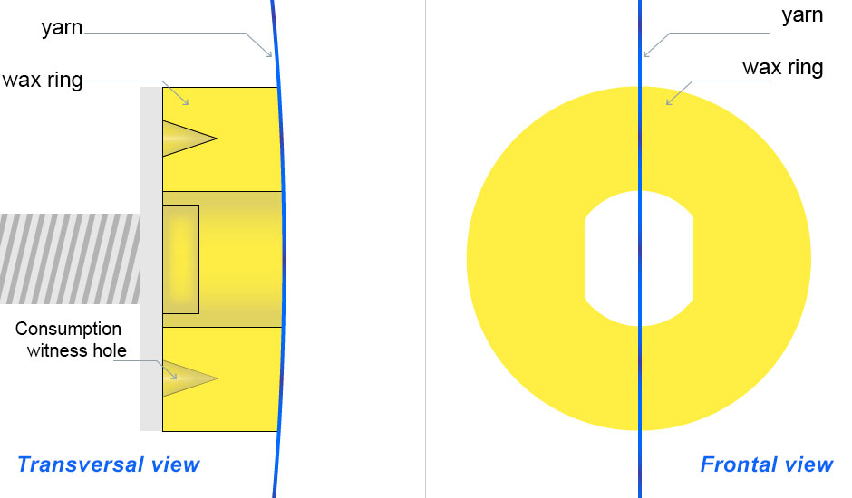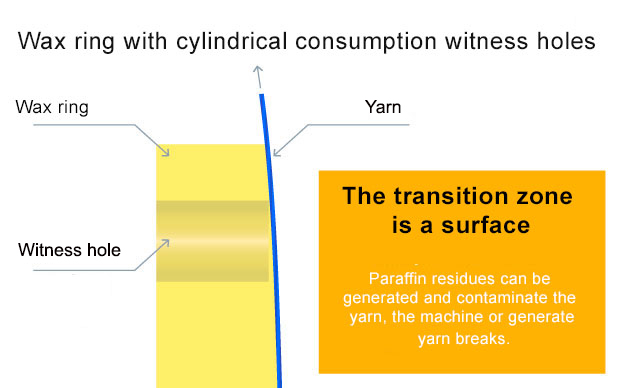 For wax mechanic systems, where the paraffin ring works with the surface in contact with the yarn facing the front, we make the C4 format ring with four conical holes at the end of the motion transmission to the ring. The holes of conical shape on the pull face of the ring allow the operator to determine accurately and continuously the thickness of the paraffin ring, achieving maximum benefit in the use of the ring. It is a patented simple and insurmountable design that does not generate waste, as it can happen with the cylindrical hole paraffin rings, which present a sudden transition zone, with the possibility of wax detachment that can reach the yarn, fall in the feed material or generate thread breaks.
